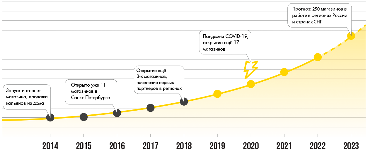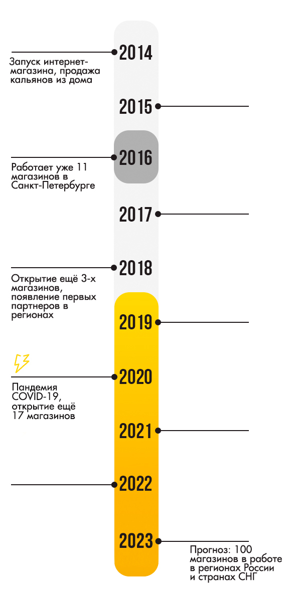 До открытия PiterSmoke у меня были разные проекты в родном городе Оренбург. Но все проекты выходили в ноль, либо с минимальными дивидендами и я чётко понимал, что мне не хватает практического опыта по бухгалтерии, настройки системы учёта, маркетингу и многим другим аспектам. По сути, когда сам пытаешься сделать бизнес без опыта, то ты являешься ремесленником и занимаешься всем начиная от продаж, заканчивая фин.учётом. И конечно такое положение дел меня демотивировало. Поэтому я начал искать франшизы, которые имеют опыт в построении собственной сети и готовы поделится этим опытом. Так как меня давно привлекала кальянная индустрия, то выбор деятельности для меня был очевиден.