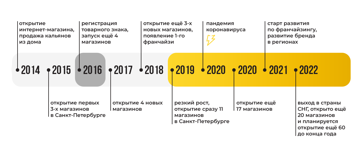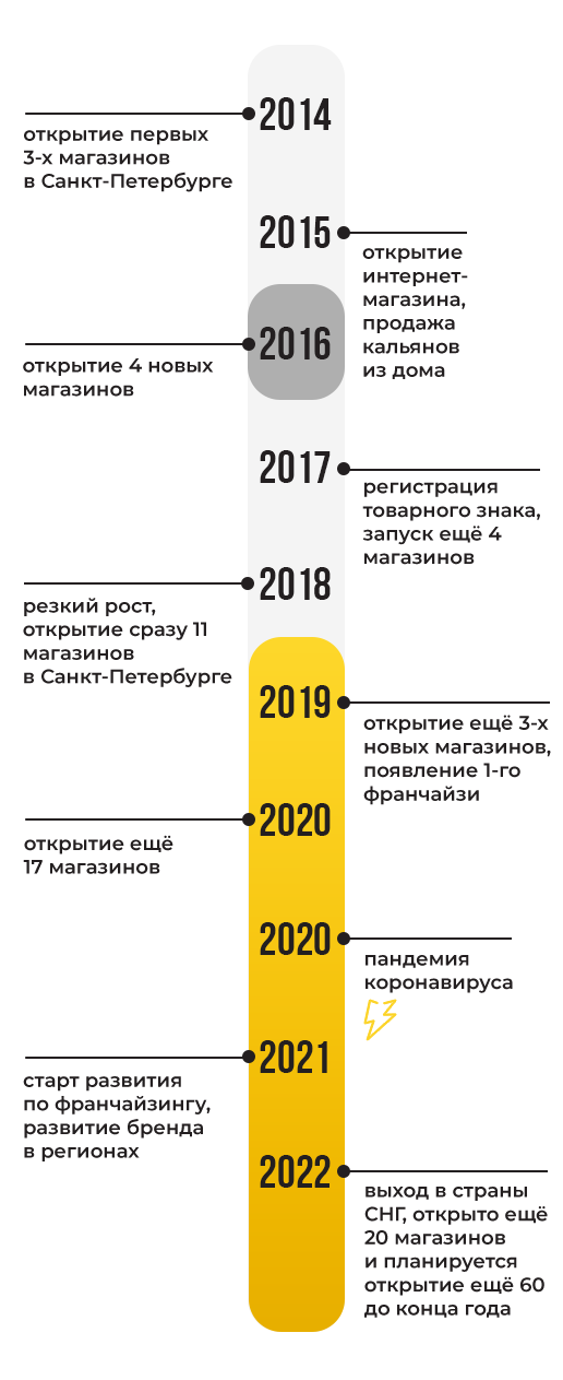 До открытия PiterSmoke у меня были разные проекты в родном городе Оренбург. Но все проекты выходили в ноль, либо с минимальными дивидендами и я чётко понимал, что мне не хватает практического опыта по бухгалтерии, настройки системы учёта, маркетингу и многим другим аспектам. По сути, когда сам пытаешься сделать бизнес без опыта, то ты являешься ремесленником и занимаешься всем начиная от продаж, заканчивая фин.учётом. И конечно такое положение дел меня демотивировало. Поэтому я начал искать франшизы, которые имеют опыт в построении собственной сети и готовы поделится этим опытом. Так как меня давно привлекала кальянная индустрия, то выбор деятельности для меня был очевиден.